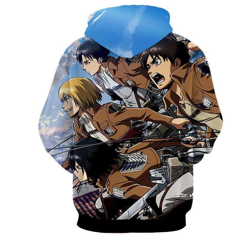 Optez pour le confort et le total style anime de ce sweat à capuche avec motif 3D de l’Attaque des Titans « Eren x Rivaille x Armin ».